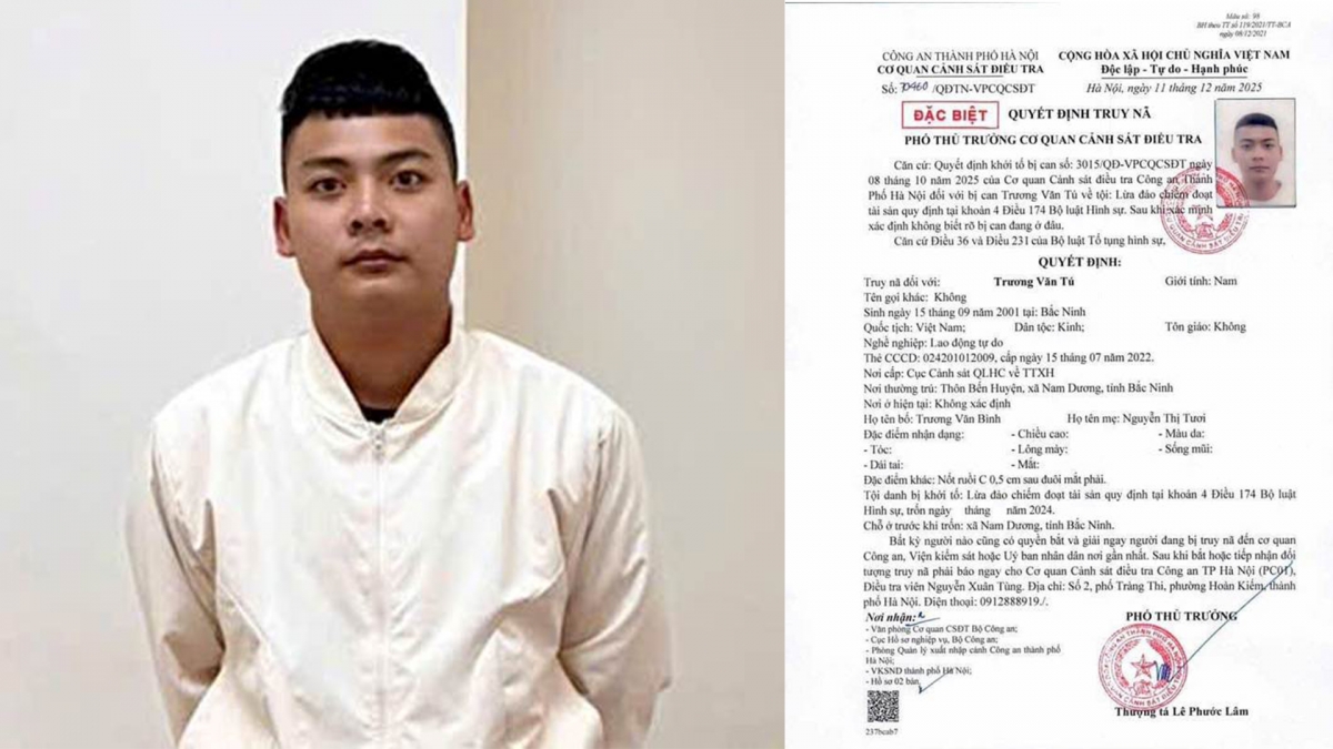 Sau khi bị khởi tố, đối tượng đã bỏ trốn khỏi nơi cư trú. Đến ngày 11/12/2025, Cơ quan Cảnh sát điều tra Công an TP Hà Nội ra quyết định truy nã bị can Trương Văn Tú.
