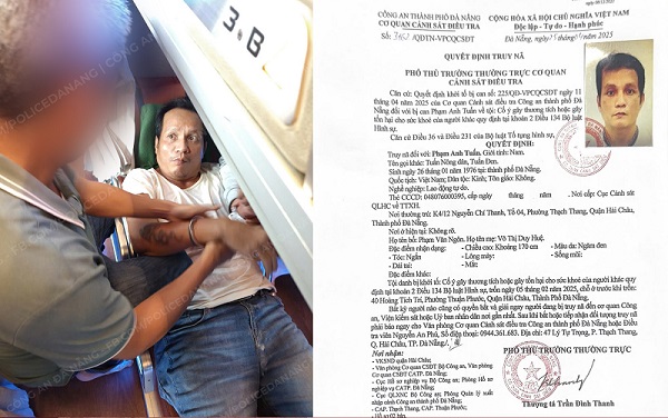 Hình ảnh Tuấn bị khống chế và Quyết định truy nã. Ảnh: Công an Đà Nẵng.