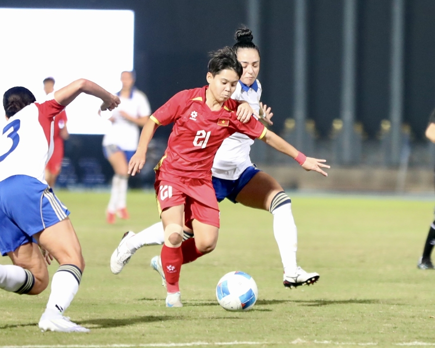 Đội tuyển bóng đá nữ Việt Nam (áo đỏ) thi đấu lấn lướt trước Philippines, nhưng để thua tiếc nuối ở những phút bù giờ cuối cùng. Ảnh: VIỆT AN