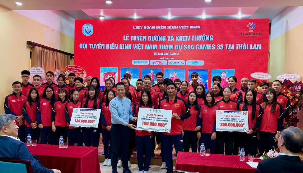 Chiều ngày 26-12, Liên đoàn điền kinh Việt Nam đã tổ chức khen thưởng 1 tỷ đồng dành cho thành tích của đội tuyển điền kinh Việt Nam tại SEA Games 33-2025. Cùng với đó các đơn vị đồng hành của Liên đoàn điền kinh Việt Nam khen thưởng thêm tổng giá trị 534 triệu đồng. Qua đó, đội tuyển điền kinh Việt Nam được khen thưởng 1 tỷ 534 triệu đồng với thành tích SEA Games 33-2025. Tại kỳ Đại hội lần này, điền kinh Việt Nam đã giành 35 huy chương (12 HCV, 12 HCB, 11 HCĐ).