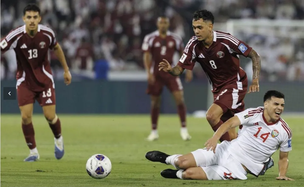 Tuyển UAE (trắng) thua Qatar 1-2 ở vòng Play off World Cup 2026 thứ nhất phải đi tìm vé tiếp. Ảnh:AFC