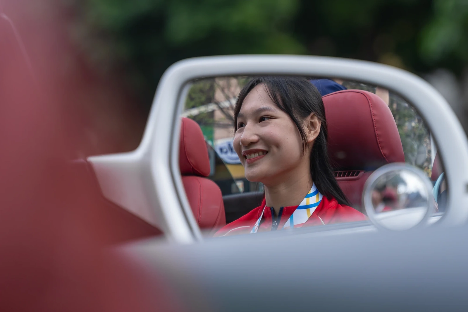 Phương Hậu rạng rỡ trên xe diễu hành từ phường Bắc Sơn về đến trung tâm phường Hạc Thành.