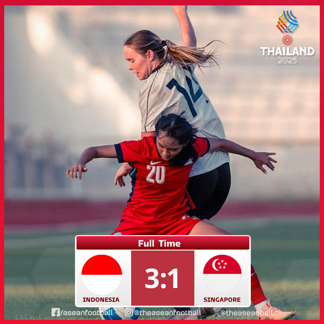 Indonesia đã hoàn tất 2 trận ở bảng A môn bóng đá nữ với 3 điểm cùng hiệu số 3/9. Đầu bảng này là Thái Lan với 3 điểm (8/0), còn Singapore đứng cuối bảng chưa có điểm nào với hiệu số 1/3. Trận cuối, Singapore phải thắng Thái Lan thì mới hy vọng lấy vé đi tiếp. Nhưng khả năng này không dễ xảy ra.