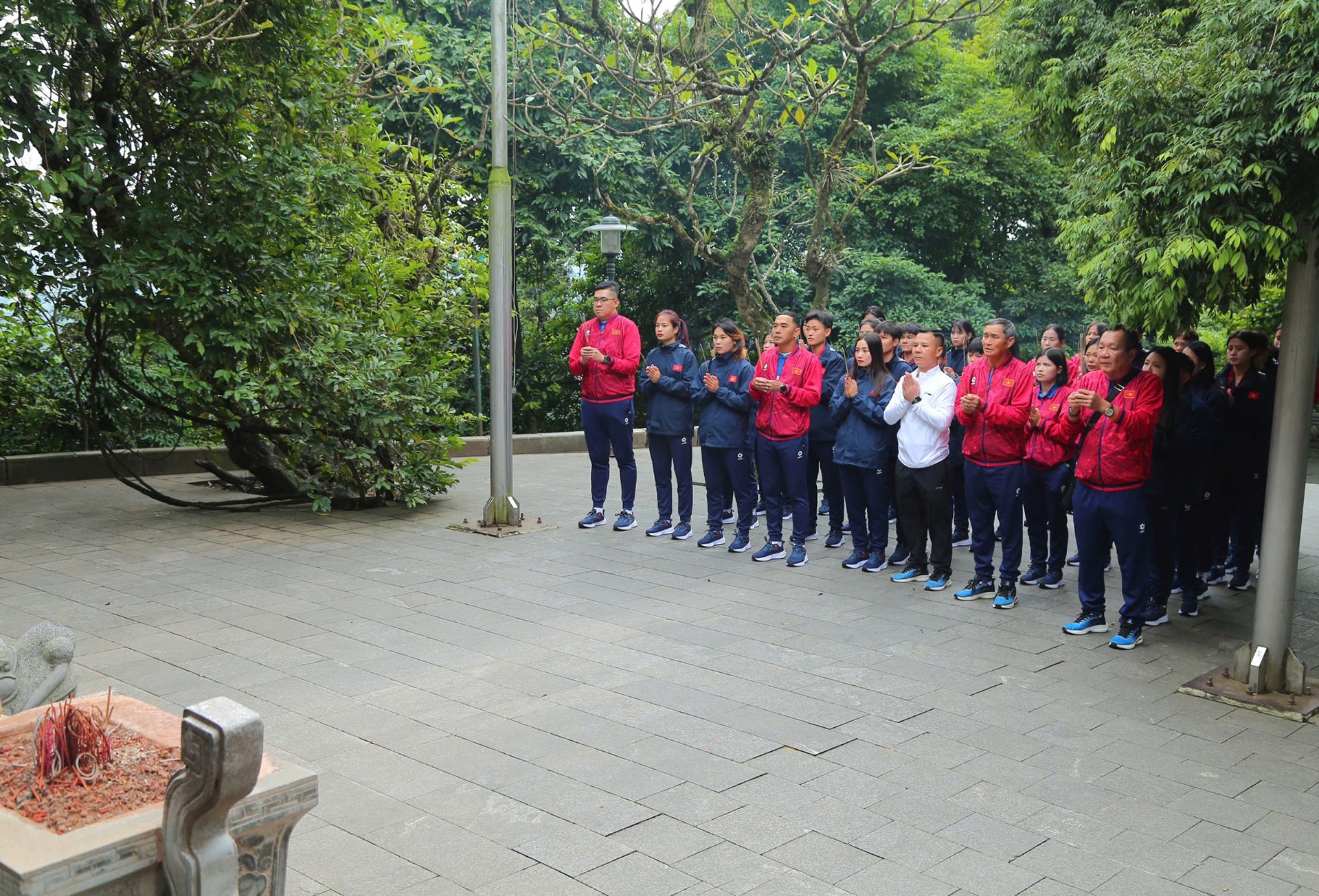 Các thành viên đội tuyển nữ Việt Nam dâng hương tưởng niệm các Vua Hùng.