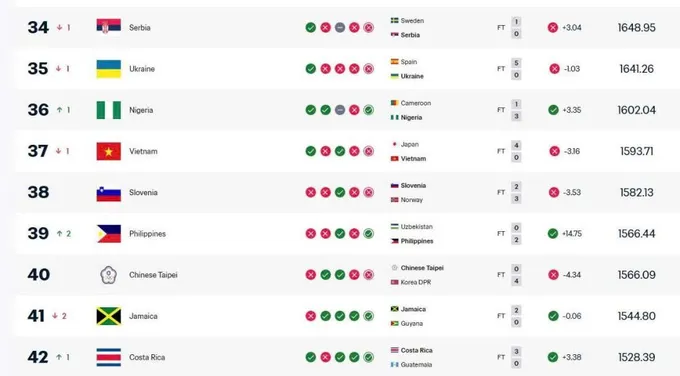 Cụ thể, đội tuyển nữ Việt Nam xếp thứ 37 thế giới với 1.593,71 điểm. Thứ hạng này được tính dựa trên thành tích thi đấu trong giai đoạn tham dự SEA Games 33 (14-12-2025) và vòng chung kết nữ châu Á 2026 diễn ra tháng 3-2026.