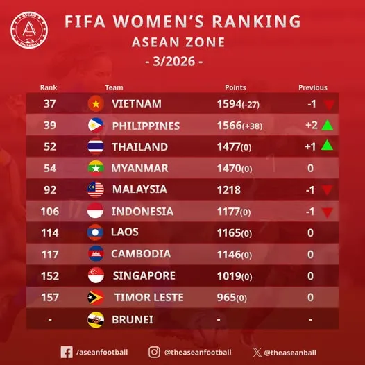Vẫn giữ ngôi số 1 Đông Nam Á, nhưng đội tuyển nữ Việt Nam đang bị Philippines thu hẹp điểm số. Đội bóng này đã tăng 2 bậc, lên hạng 39 thế giới với 1.566 điểm (+38), khoảng cách rất gần với ngôi số 1 trong khu vực mà đội tuyển Việt Nam đang nắm giữ.