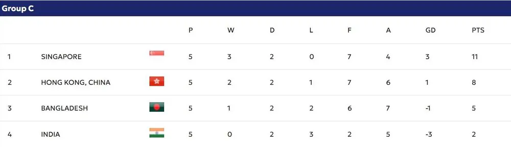 Sau 5 lượt trận ở bảng C, đội tuyển Singapore dẫn đầu bảng với 11 điểm, phía sau là Hong Kong (8 điểm), đội xếp thứ 3 không còn khả năng cạnh tranh ngôi nhất là Bangladesh (5 điểm). Nếu lượt trận cuối Singapore thua Bangladesh ngay trên sân nhà, còn Hong Kong thắng Ấn Độ ngay tại Ấn Độ cũng không thể lấy ngôi nhất của Singapore. Vì lúc đó Singapore và Hong Kong cùng 11 điểm nhưng đối đầu Singapore tốt hơn (hai đội hòa nhau 0-0 tại Singapore và Singapore thắng 2-1 tại Hong Kong).