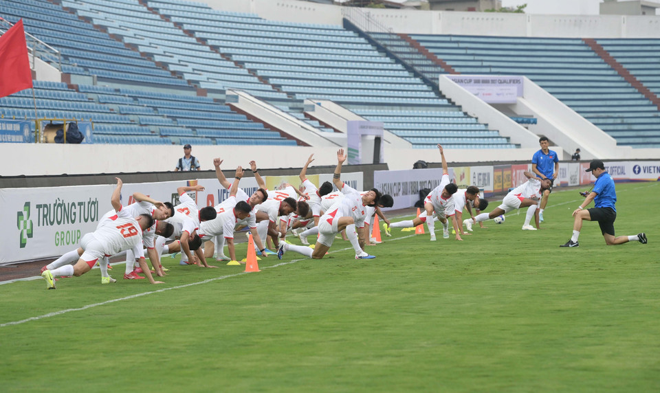 Các cầu thủ Đội tuyển Việt Nam tập khởi động. (Ảnh: Công Luật/TTXVN)
