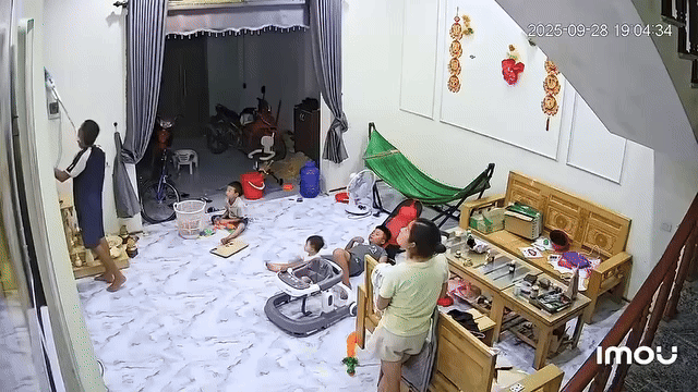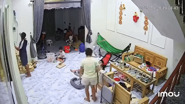 Đáng chú ý, khi người vợ bước đí, chiếc ghế xếp mà chị đứng dựa vào lúc nãy bị mất thăng bằng nên ngã xuống sàn nhà, tạo ra tiếng động mạnh.