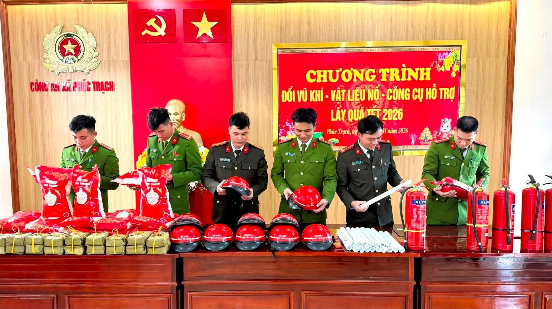 Sau khi giao nộp, người dân được nhận các phần quà Tết thiết thực, do Công an xã gửi tặng như gạo nếp, bánh chưng, nón bảo hiểm, lịch tết, bình chữa cháy...