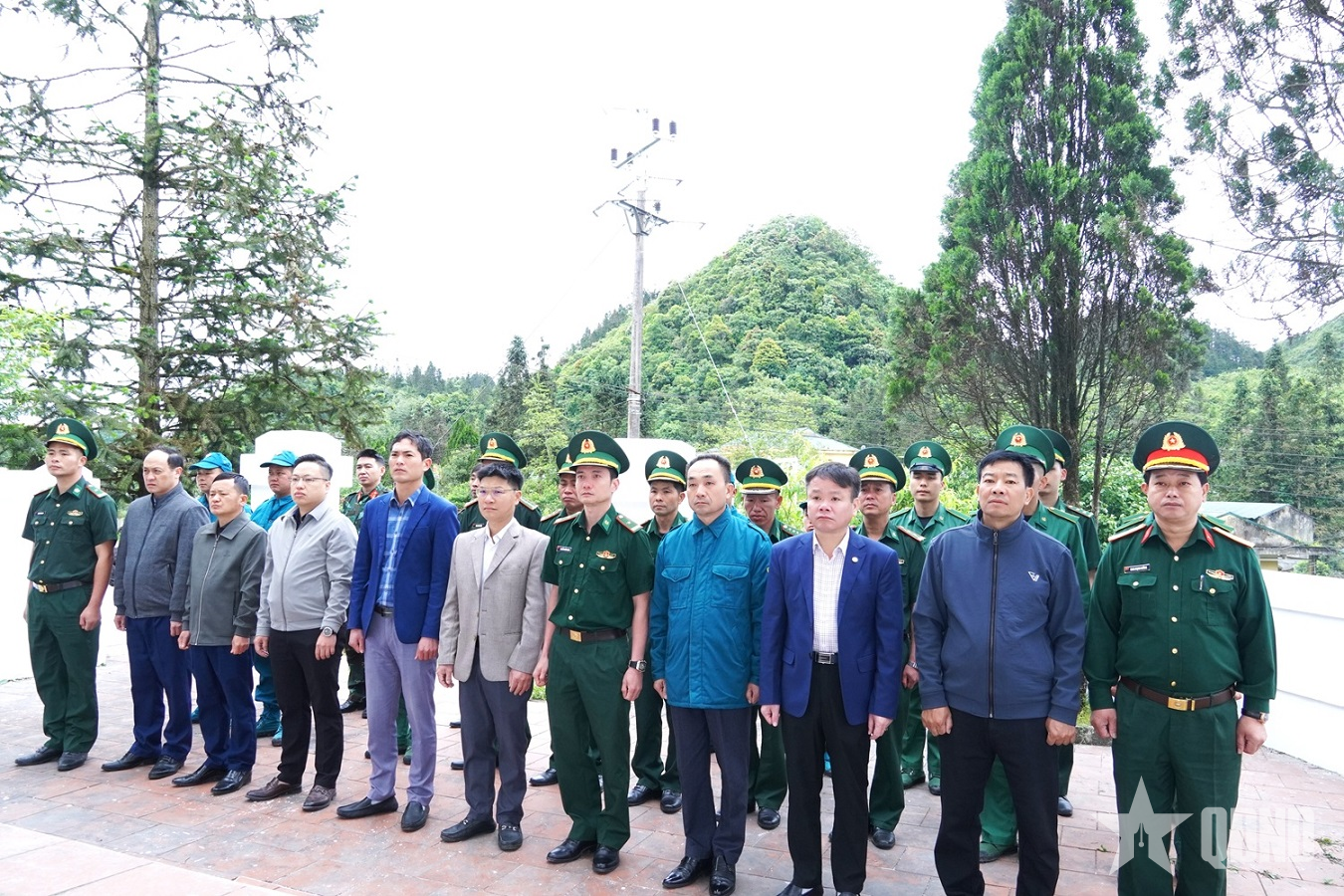 Đồng chí Nguyễn Huy Sắc, Bí thư Đảng ủy xã, chủ tịch HĐND Sơn Vĩ và chỉ huy Đồn Biên phòng Cửa khẩu Săm Pun dâng hương, dâng lễ tưởng niệm các Anh hùng liệt sĩ.