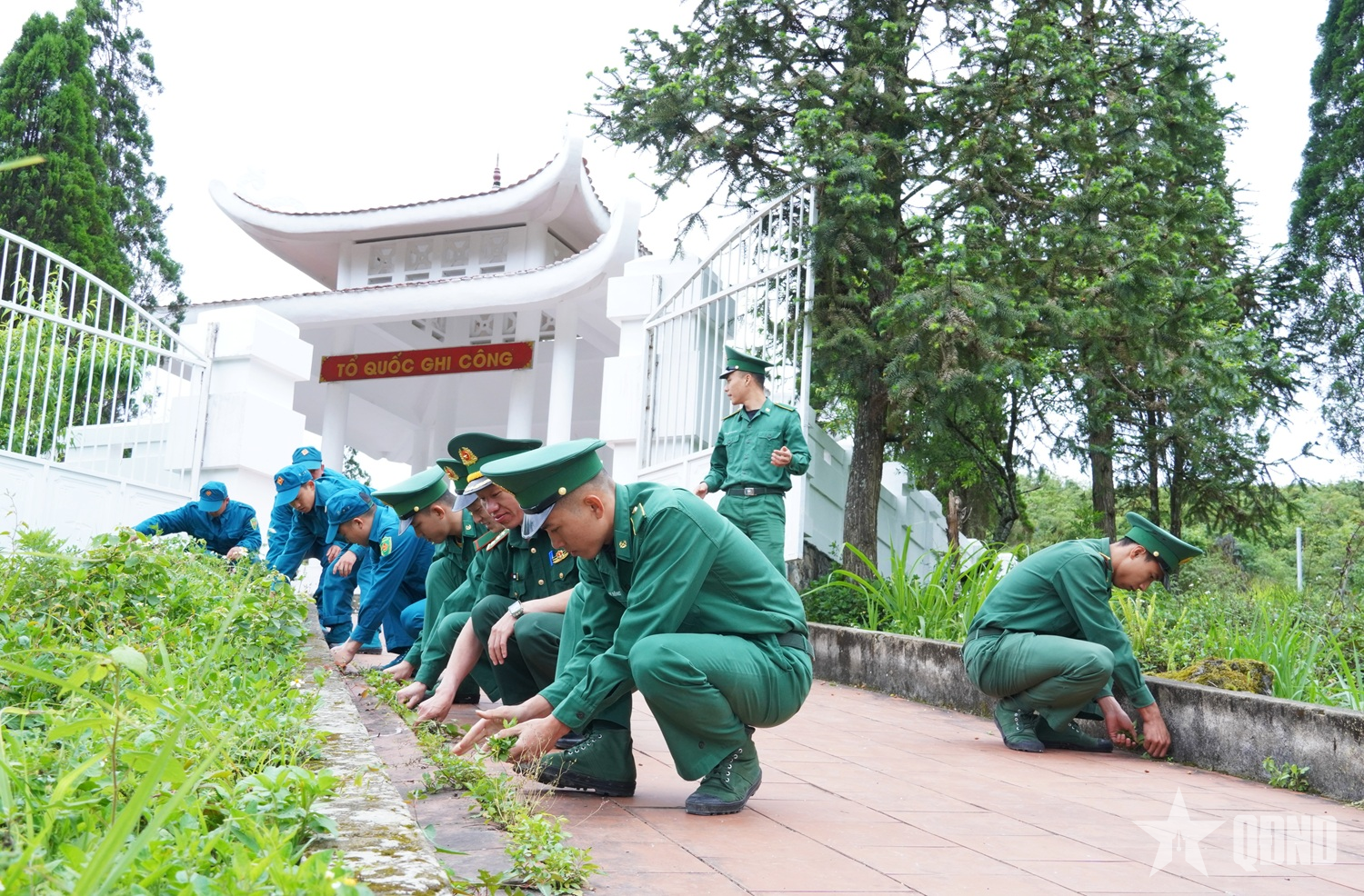 Cán bộ, chiến sĩ Đồn Biên phòng Cửa khẩu Săm Pun và lực lượng dân quân xã Sơn Vĩ tổng vệ sinh, chỉnh trang khuôn viên Đài tưởng niệm các Anh hùng liệt sĩ.