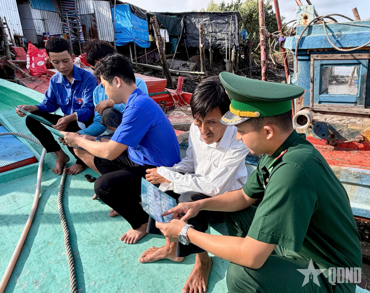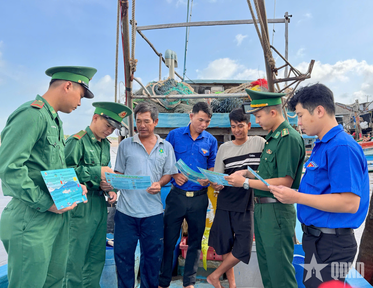 Tổ công tác phát tờ rơi tuyên truyền chống khai thác IUU cho các phương tiện và các thuyền viên.