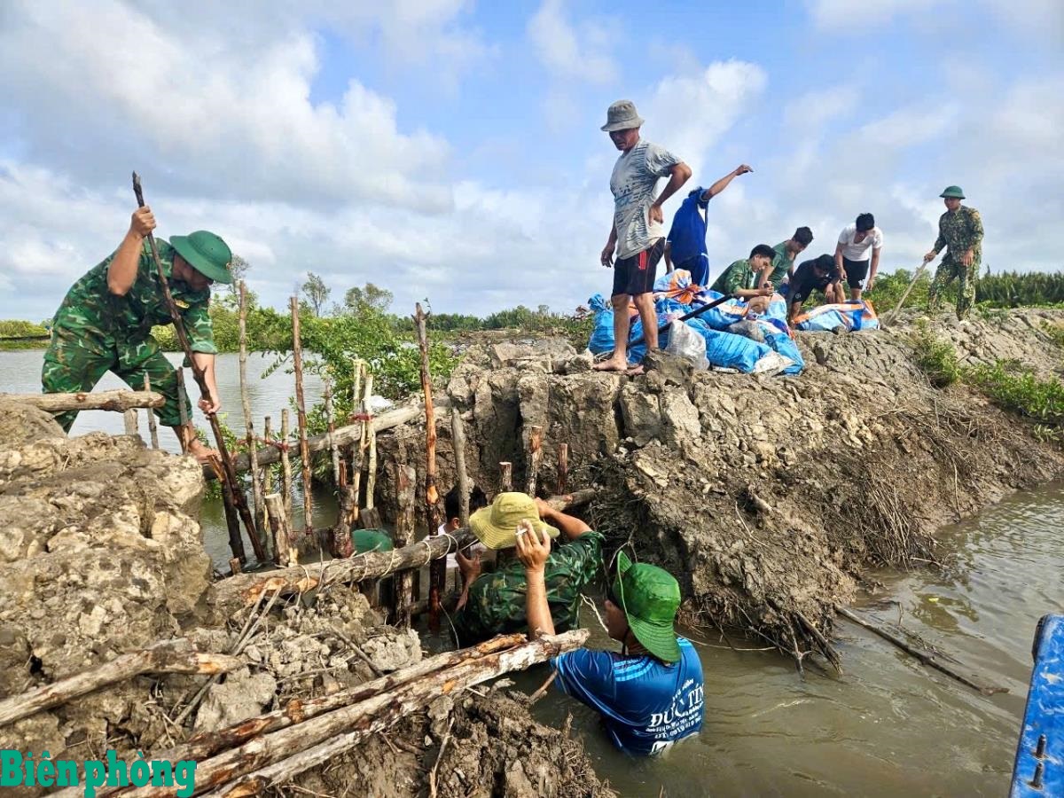 Do nắng nóng kéo dài nhiều ngày, bề mặt bờ bao xuất hiện một số vị trí bị rạn nứt kích thước lớn do đất bị giảm khả năng liên kết, kết hợp với ảnh hưởng của thủy triều dâng cao quá mức làm vỡ một đoạn bờ bao vuông tôm với chiều dài gần 3 mét của hộ ông Trương Văn Xuyên, sinh năm 1978, trú tại ấp Thuận Long A, xã Tân Tiến, tỉnh Cà Mau. Ngay sau khi tiếp nhận thông tin, Ban Chỉ huy Đồn Biên phòng Tân Tiến đã nhanh chóng triển khai lực lượng gồm 20 cán bộ, chiến sĩ cơ động đến vị trí vuông tôm của hộ ông Trương Văn Xuyên để hỗ trợ, khắc phục sự cố.