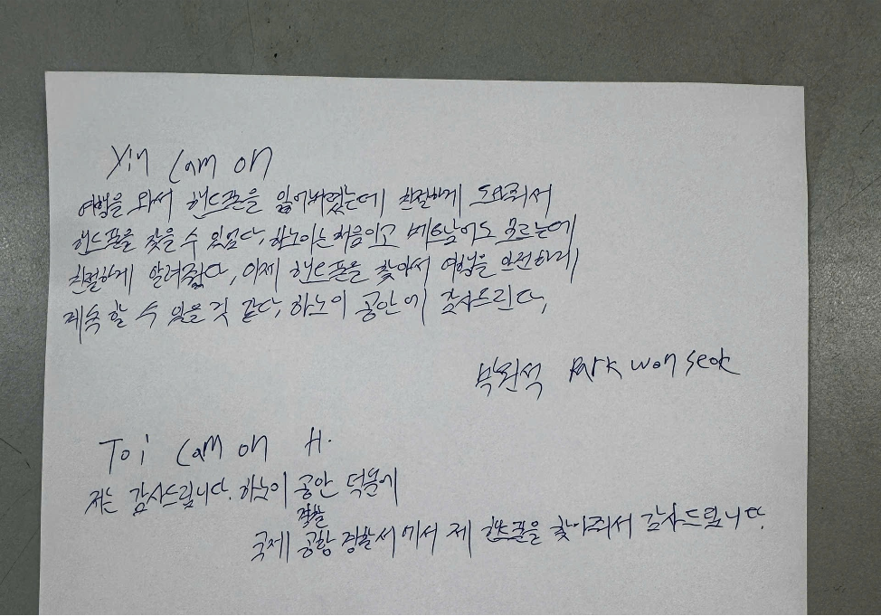 Với tinh thần tận tụy và trách nhiệm cao trong công tác, Ban Chỉ huy Đồn Công an Sân bay Quốc tế Nội Bài đã chỉ đạo các lực lượng nhanh chóng triển khai các biện pháp xác minh, phối hợp với các đơn vị liên quan để hỗ trợ tìm kiếm tài sản cho hành khách. Nhận lại tài sản bị thất lạc, anh Park Wonseok đã viết thư cảm ơn tập thể CBCS Đồn Công an Sân bay Quốc tế Nội Bài về hành động kịp thời, trách nhiệm và tận tâm.
