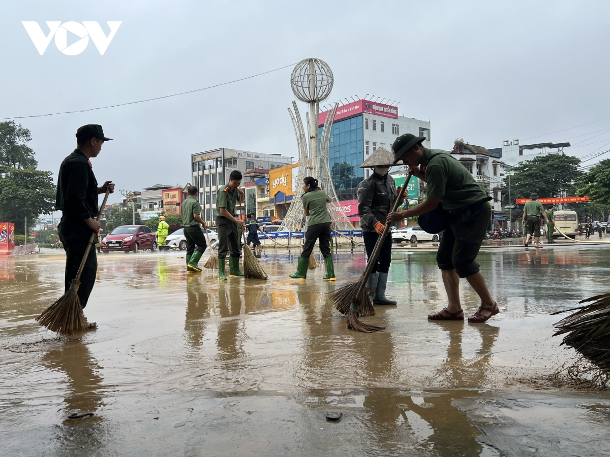Không khí khẩn trương, đoàn kết lan tỏa trên đường phố, thể hiện tinh thần chủ động, đồng lòng vượt qua khó khăn của người dân vùng lũ. Chị Vũ Thị Phương Hoa ở khu vực ngã năm Cao Lanh, đường Điện Biên, phường Yên Bái cho biết: "Các anh bộ đội, công an đã hỗ trợ dọn rửa giúp bà con khu phố. Chúng em sáng nay cũng đến sớm để dọn dẹp, do lớp bùn khá mỏng nên dọn cũng nhanh".