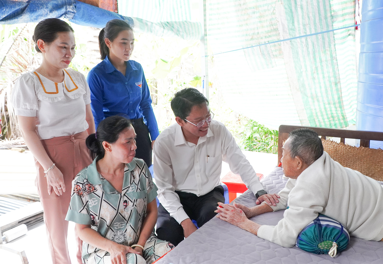 Chủ tịch Ủy ban nhân dân xã Tân Hội Nguyễn Minh Ngọc thăm hỏi bà Trương Thị Lố, 80 tuổi, ngụ ấp Đập Đá.