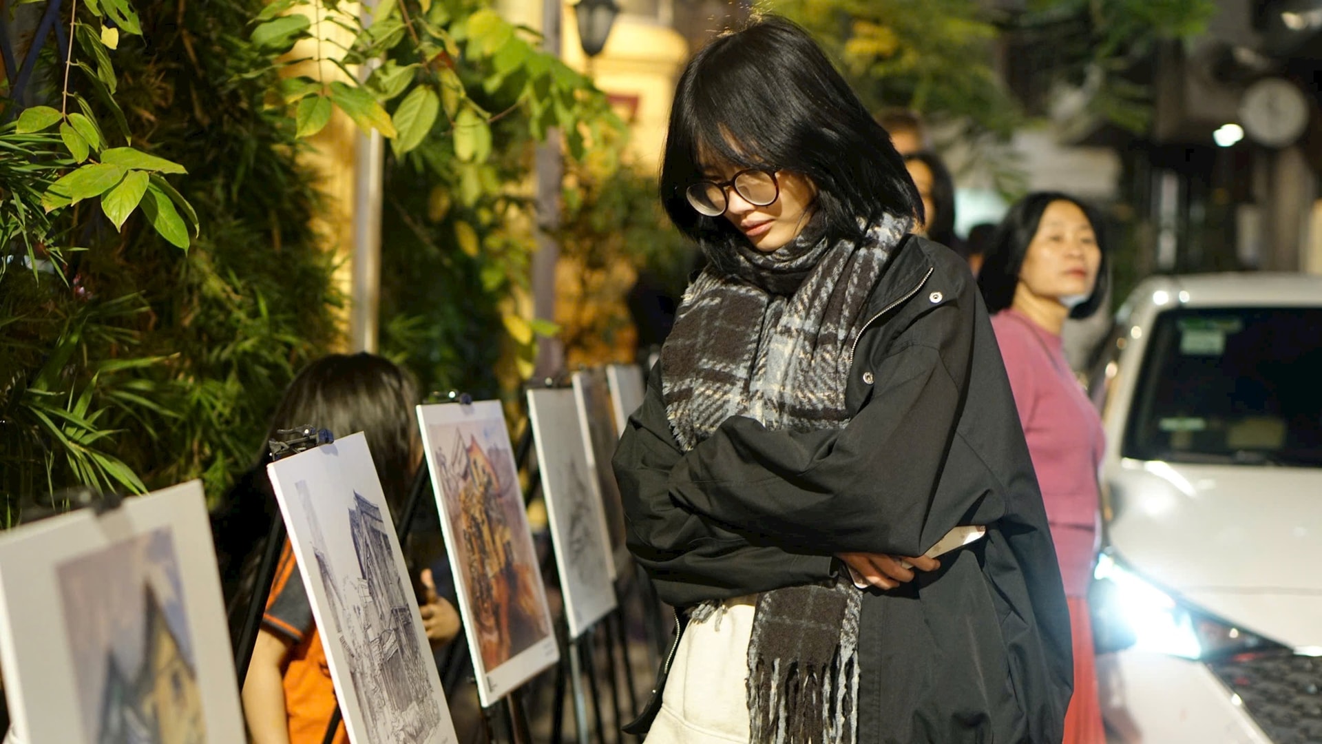Người dân Thủ đô và du khách tham quan trưng bày ký họa “Ký họa xóm Hà Hồi - Góc nhỏ di sản đô thị”. Ảnh: Trung Nguyên