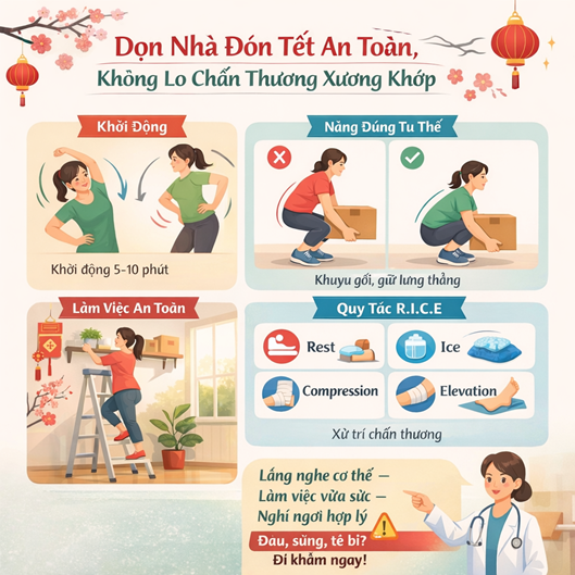 Bác sĩ khuyến cáo, một ngôi nhà sạch đẹp chỉ thực sự ý nghĩa khi mọi người đủ sức khỏe để tận hưởng những ngày Tết bên gia đình. Làm việc vừa sức, nghỉ ngơi hợp lý và giữ tư thế đúng không chỉ giúp phòng tránh chấn thương mà còn bảo vệ lâu dài hệ cơ xương khớp.