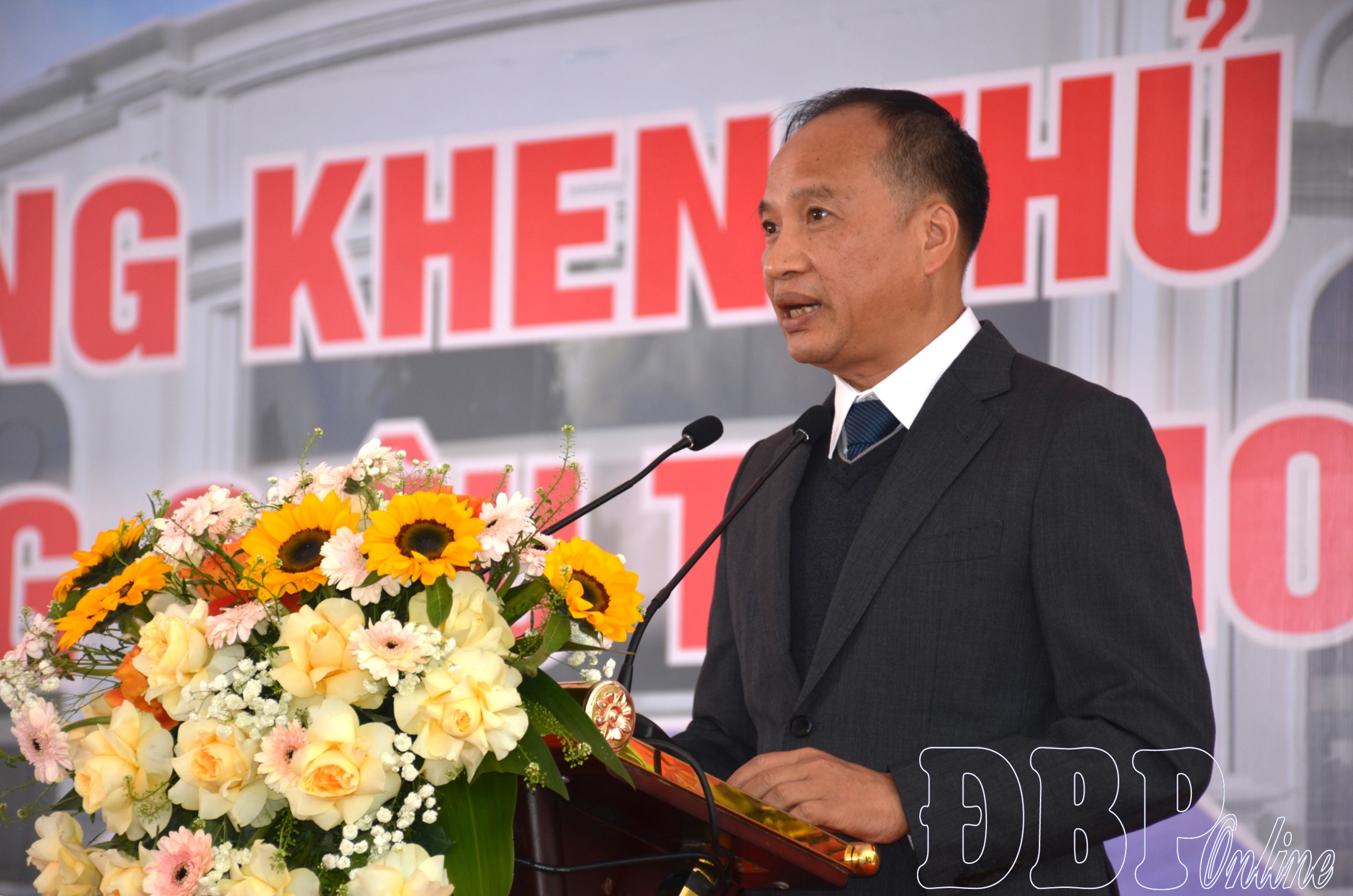 Ông Nguyễn Chí Ba, Tổng Giám đốc Công ty TNHH Giáo dục và Thương mại Dịch vụ Hoa Ba phát biểu khai trương Siêu thị Hoa Ba Tuần Giáo.