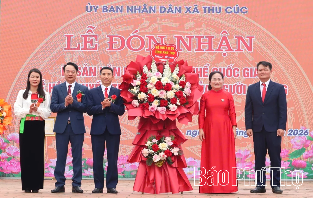 Đại diện lãnh đạo Sở Văn hóa, Thể thao và Du lịch tỉnh tặng hoa chúc mừng xã Thu Cúc.