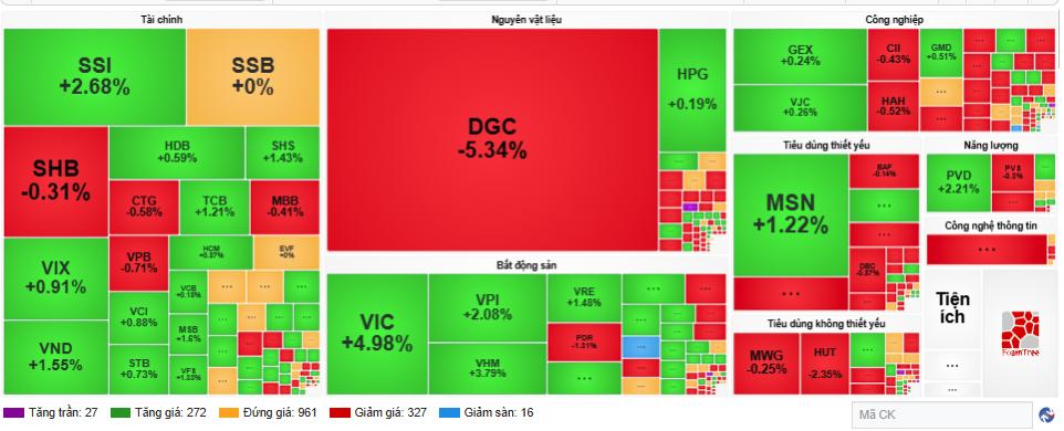 Độ rộng thị trường ghi nhận 272 mã tăng, 326 mã giảm và tới 962 mã đứng giá, phản ánh trạng thái phân hóa rõ nét. Đà tăng của chỉ số chủ yếu đến từ nhóm cổ phiếu vốn hóa lớn, đặc biệt là bất động sản và tài chính.