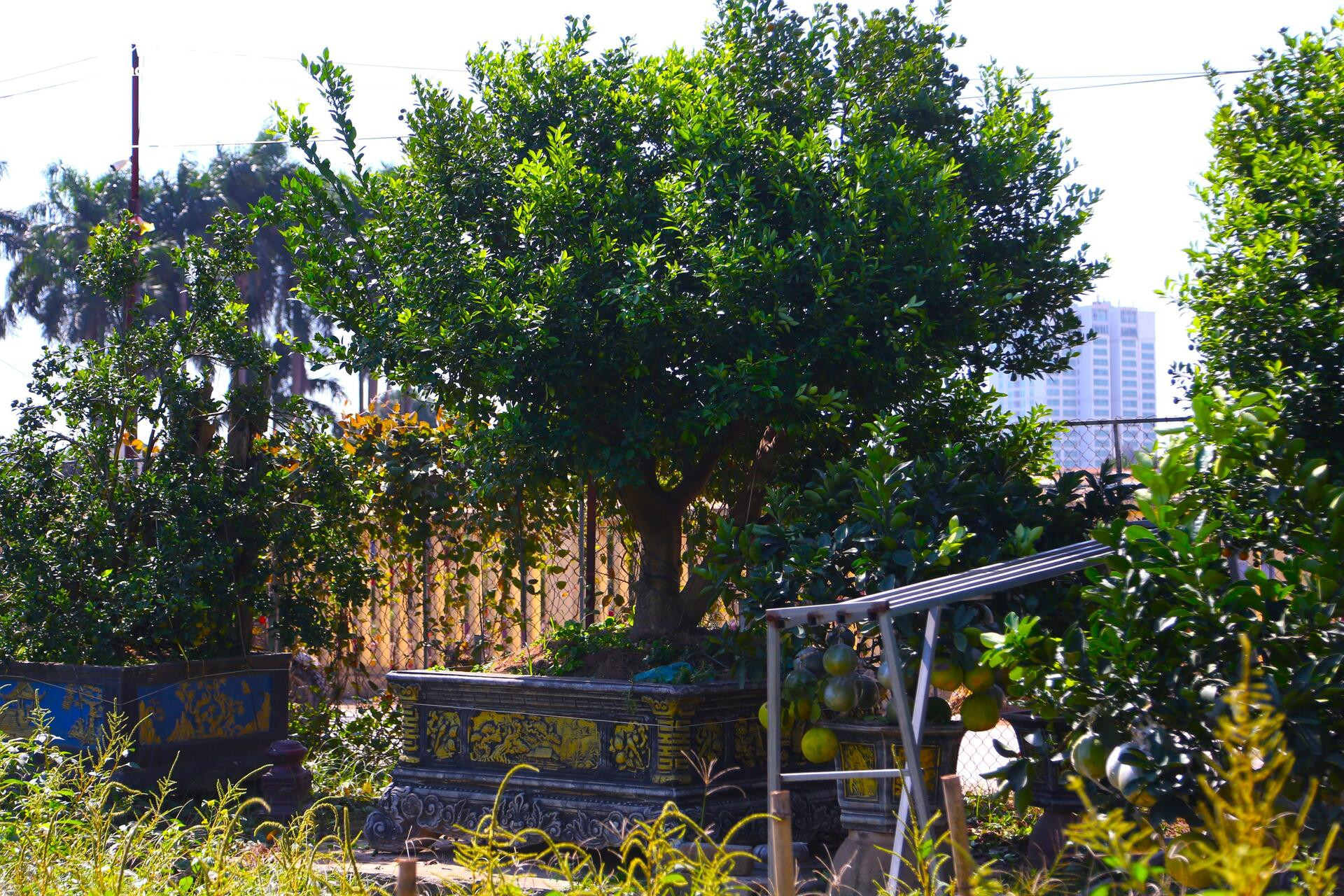 Bưởi Diễn cảnh thường được trồng trong chậu lớn hoặc ghép bonsai, tạo dáng cân đối, cành tỏa đều, lá xanh mướt, quả vàng rực rỡ.