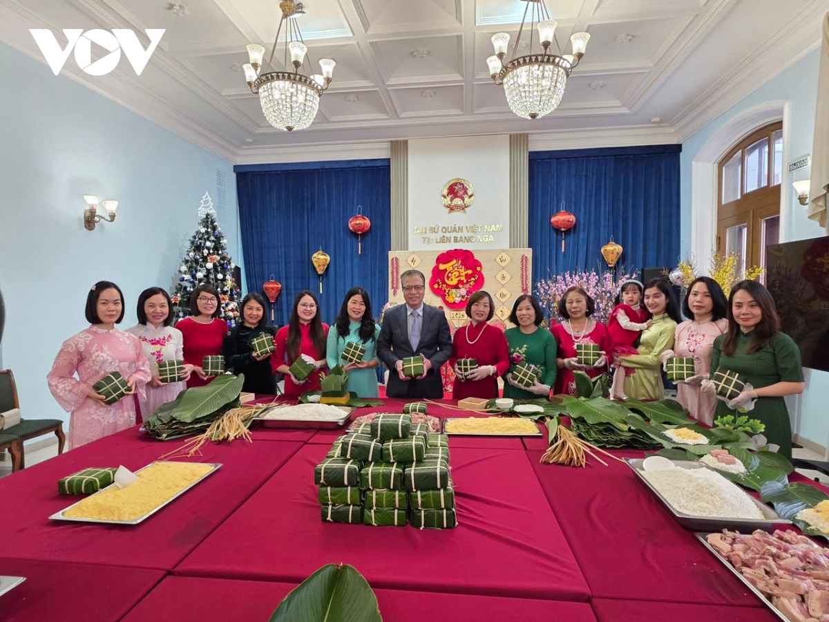 Gói bánh chưng chuẩn bị đón Xuân Bính Ngọ ở Đại sứ quán Việt Nam tại LB Nga