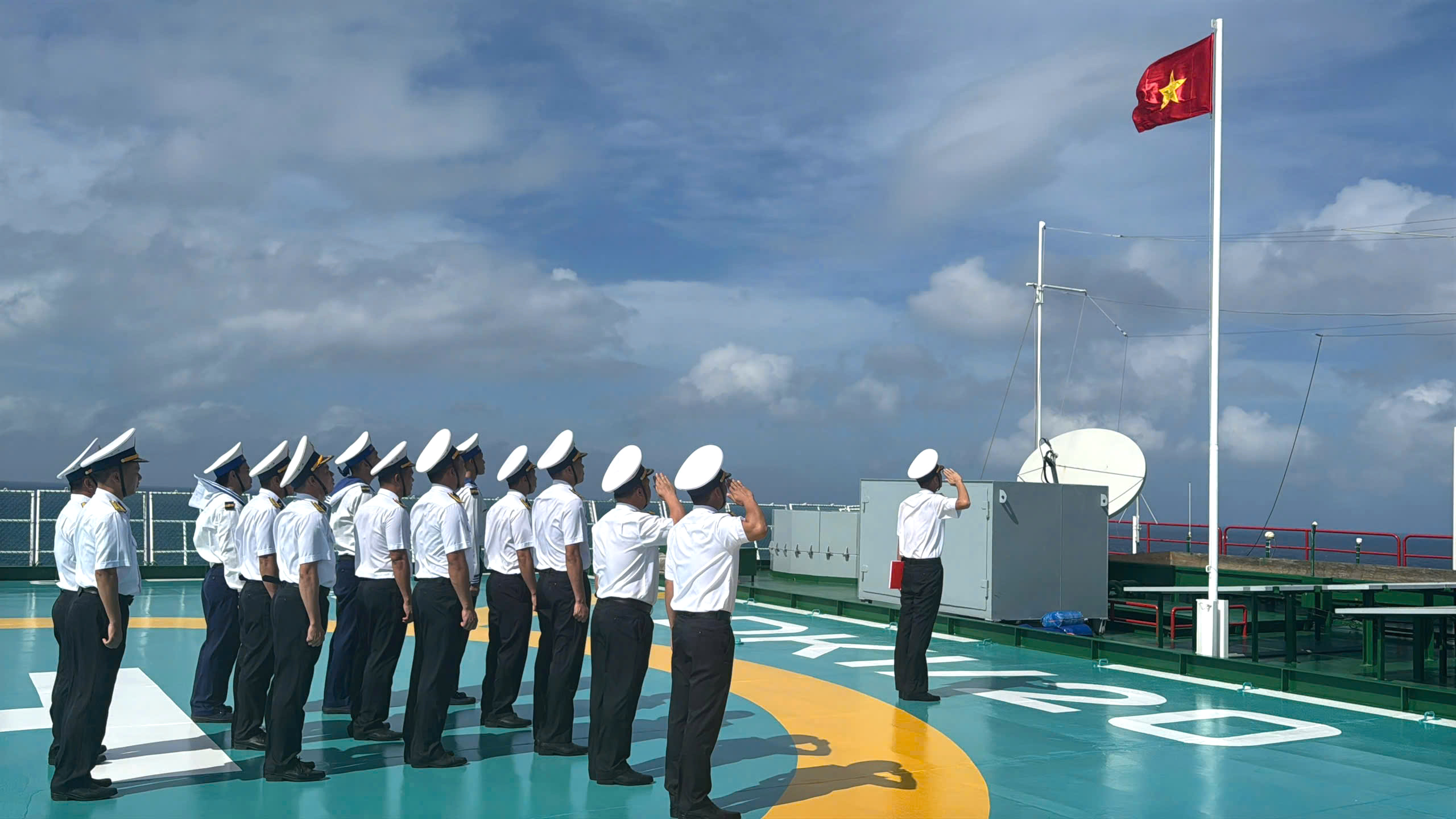 Sáng mùng 1 Tết, giữa sóng gió biển trời trên thềm lục địa phía Nam của Tổ quốc, các cán bộ, chiến sĩ nhà giàn DK1/20 trang nghiêm tổ chức lễ chào cờ.