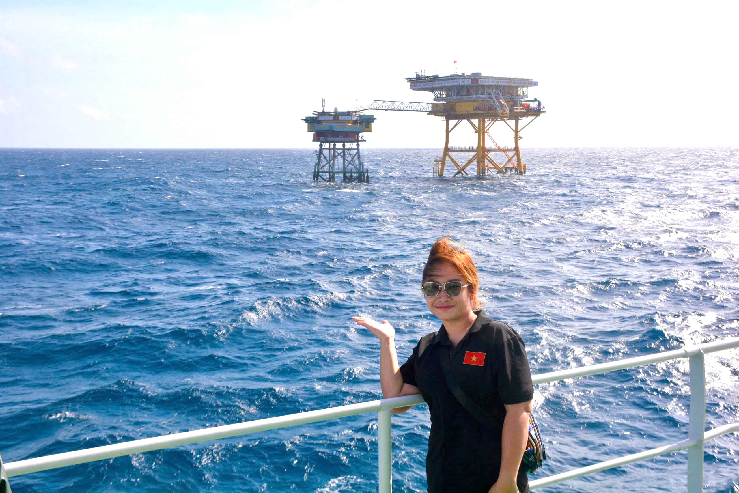 Chị Nguyễn Thị Thùy Dương, cán bộ thuộc Hội Biển Đảo Việt Nam, chụp ảnh kỷ niệm với các điểm nhà giàn DK1.