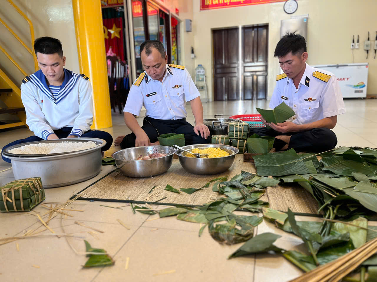 Các cán bộ, chiến nhà giàn quây quần bên nhau, vừa đãi gạo, lau lá dong vừa gói bánh chưng tạo không khí đầm ấm vào mỗi dịp Tết đến Xuân về.