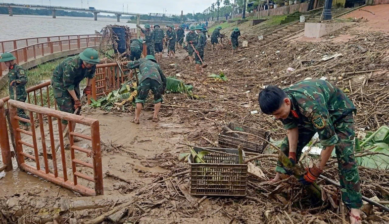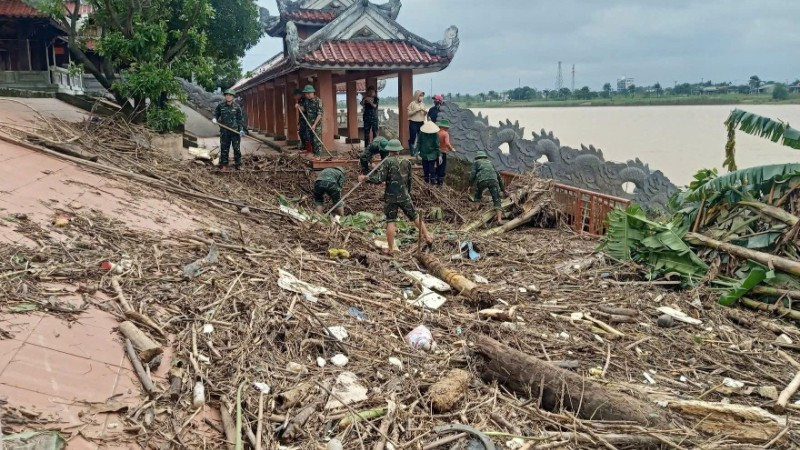 Cán bộ, chiến sĩ Ban Chỉ huy Phòng thủ Khu vực 4-Triệu Phong dọn dẹp rác và bùn tại Bến thả hoa bờ nam sông Thạch Hãn.