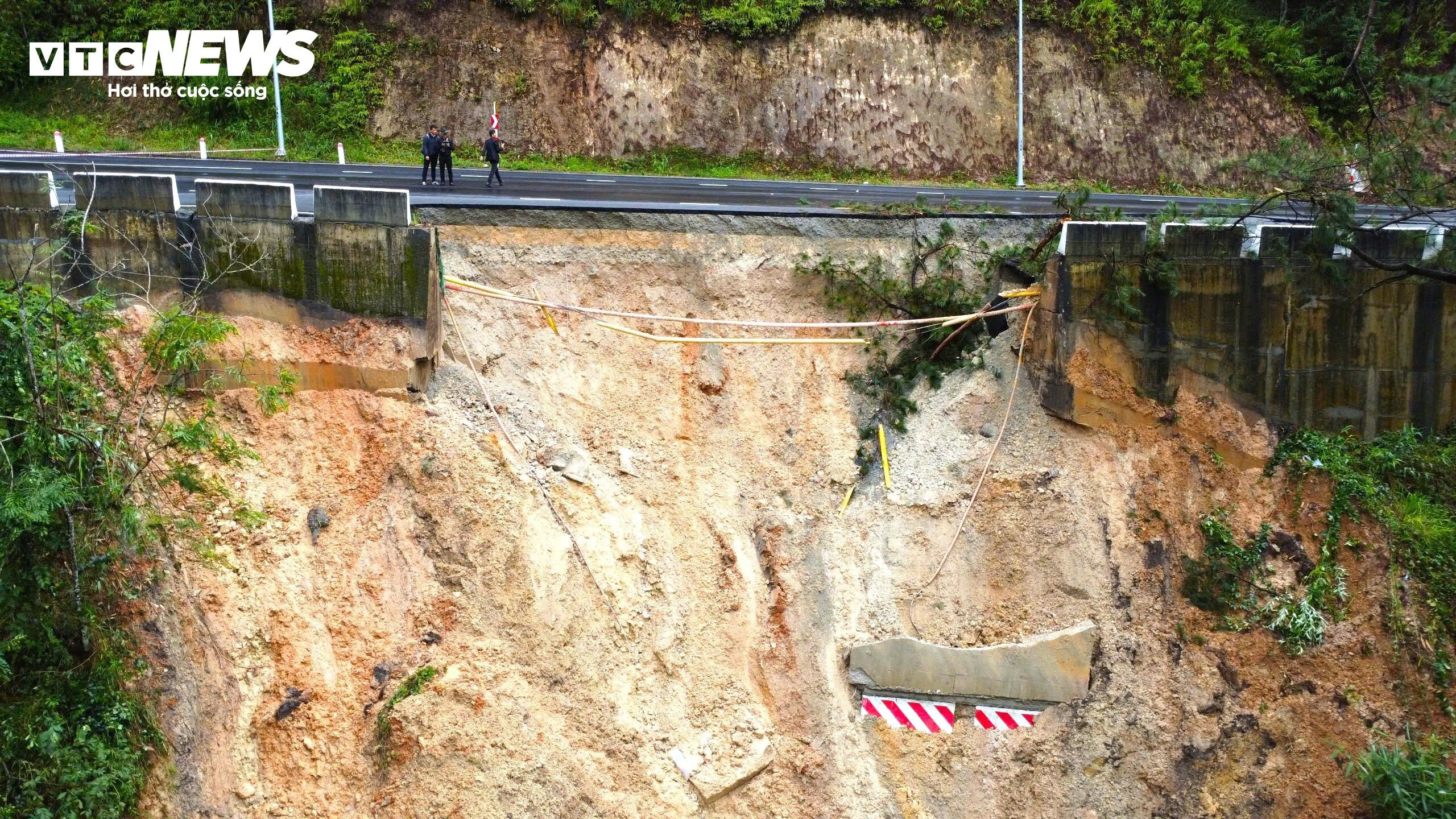 Một lượng lớn đất đá, mặt đường trôi xuống vực sâu bên dưới.