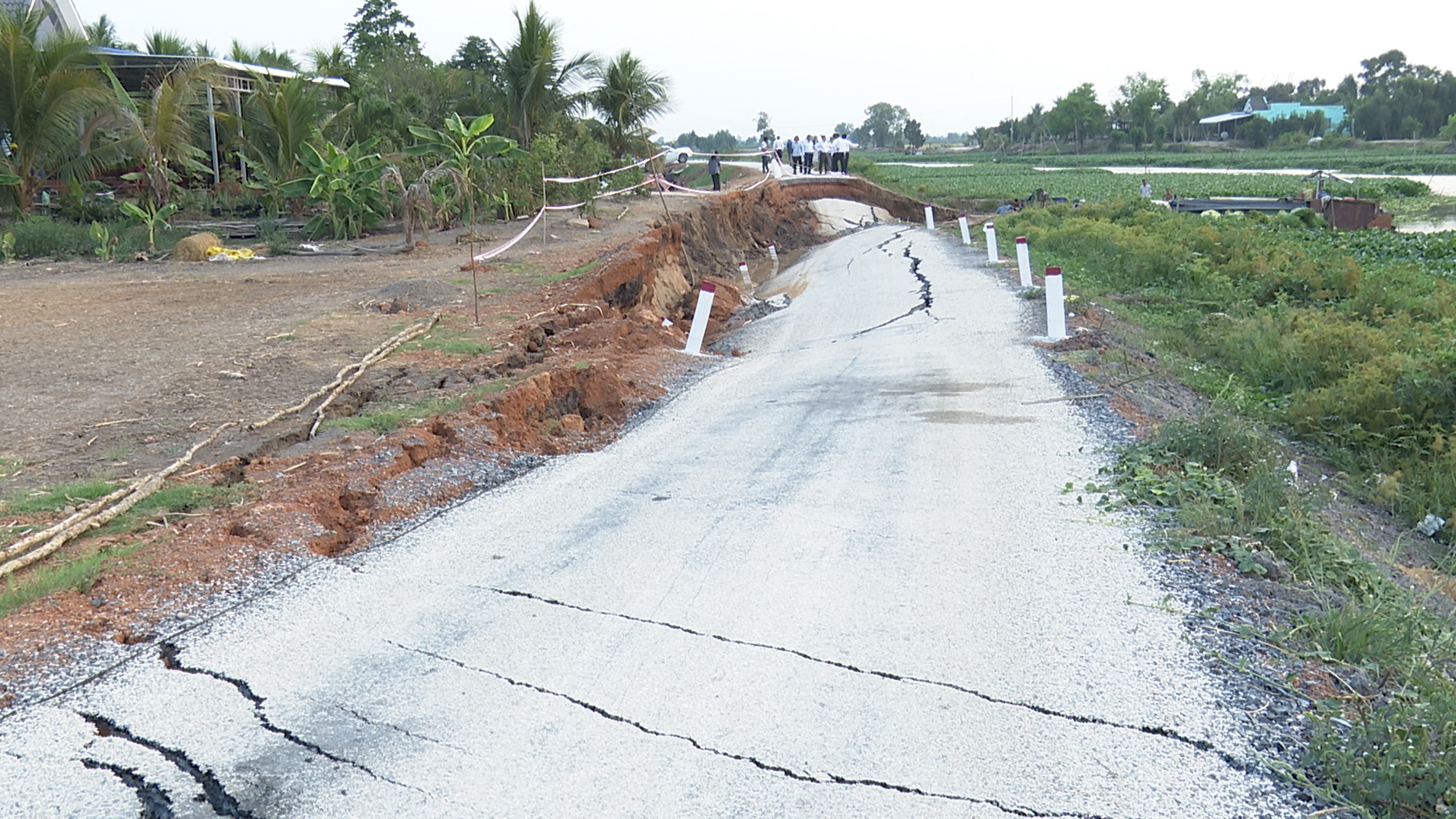Tại tỉnh Đồng Tháp, ngày 12-4, tuyến đê ngăn triều Phú An, cũng là đường giao thông nông thôn ở xã Bình Phú bị sụt lún, toàn bộ thân đê dài 75m chìm xuống sông. Hiện khu vực xung quanh xuất hiện nhiều vết nứt, có nguy cơ tiếp tục bị lún, sạt, đe dọa khoảng 500ha vườn sầu riêng đã cho trái. Tại xã Vĩnh Hưng (tỉnh Tây Ninh), một đoạn đường bờ đông sông Lò Gạch (ấp Xóm Mới) cũng bị sụt lún, sạt lở vào ngày 13-4. Mặt đường một đoạn dài 60m bị nứt toác, trượt dài về phía sông…