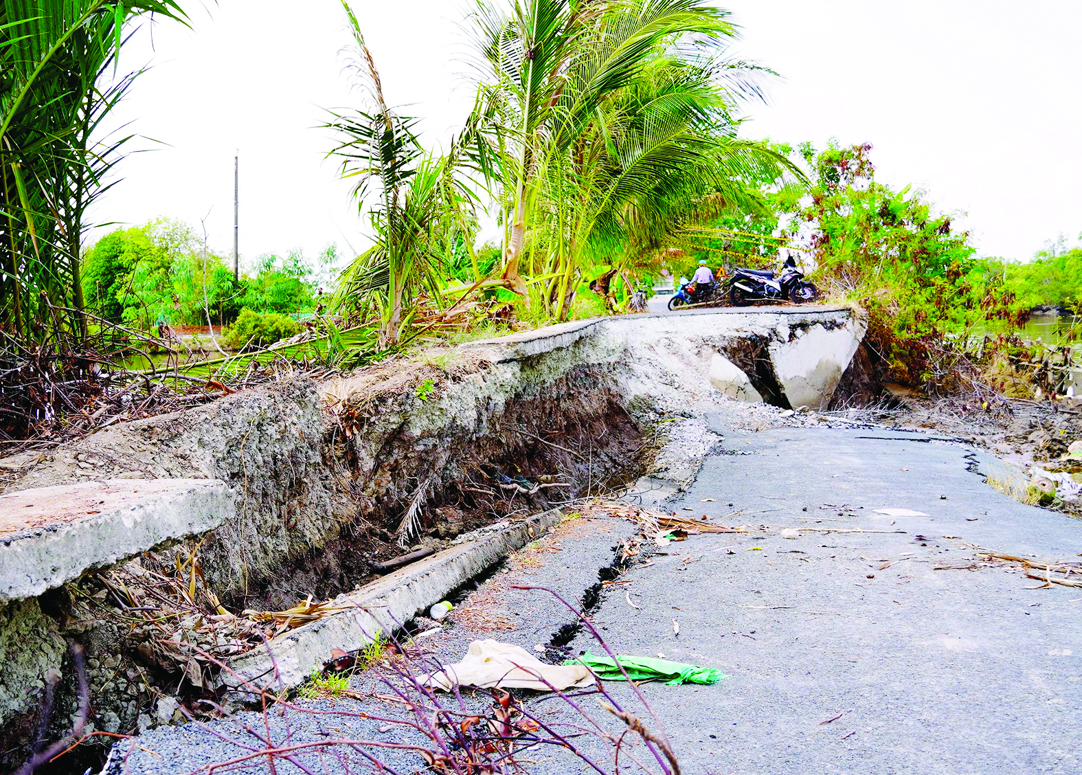 Cũng tại tỉnh Cà Mau, gần nửa tháng qua, việc sinh hoạt, đi lại, giao thương hàng hóa của hàng trăm hộ dân ở xã Cái Nước gặp nhiều khó khăn, do tuyến đường kênh xáng Đông Hưng đoạn qua ấp Khánh Tư bị sụt lún, sạt lở trên đoạn dài. “Giờ muốn qua bên kia khu vực sạt lở phải đi bộ, còn vận chuyển hàng hóa, đưa con đi học bằng xe máy, ô tô phải đi đường vòng cả chục kilomet, mất nhiều thời gian, chi phí”, bà Nguyễn Kiều Thơ, nhà gần điểm sạt lở, lo ngại. Trước đó, tuyến đường bị sụt lún, sạt lở hôm 9-4, tuy nhiên đến nay chính quyền địa phương chỉ gia cố tạm bằng cọc gỗ và lắp biển báo nguy hiểm, chưa khắc phục kiên cố vì chưa có vốn.