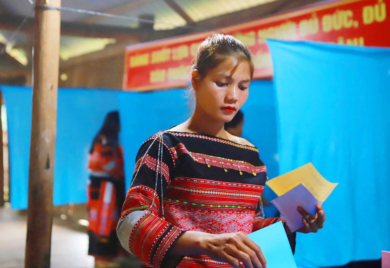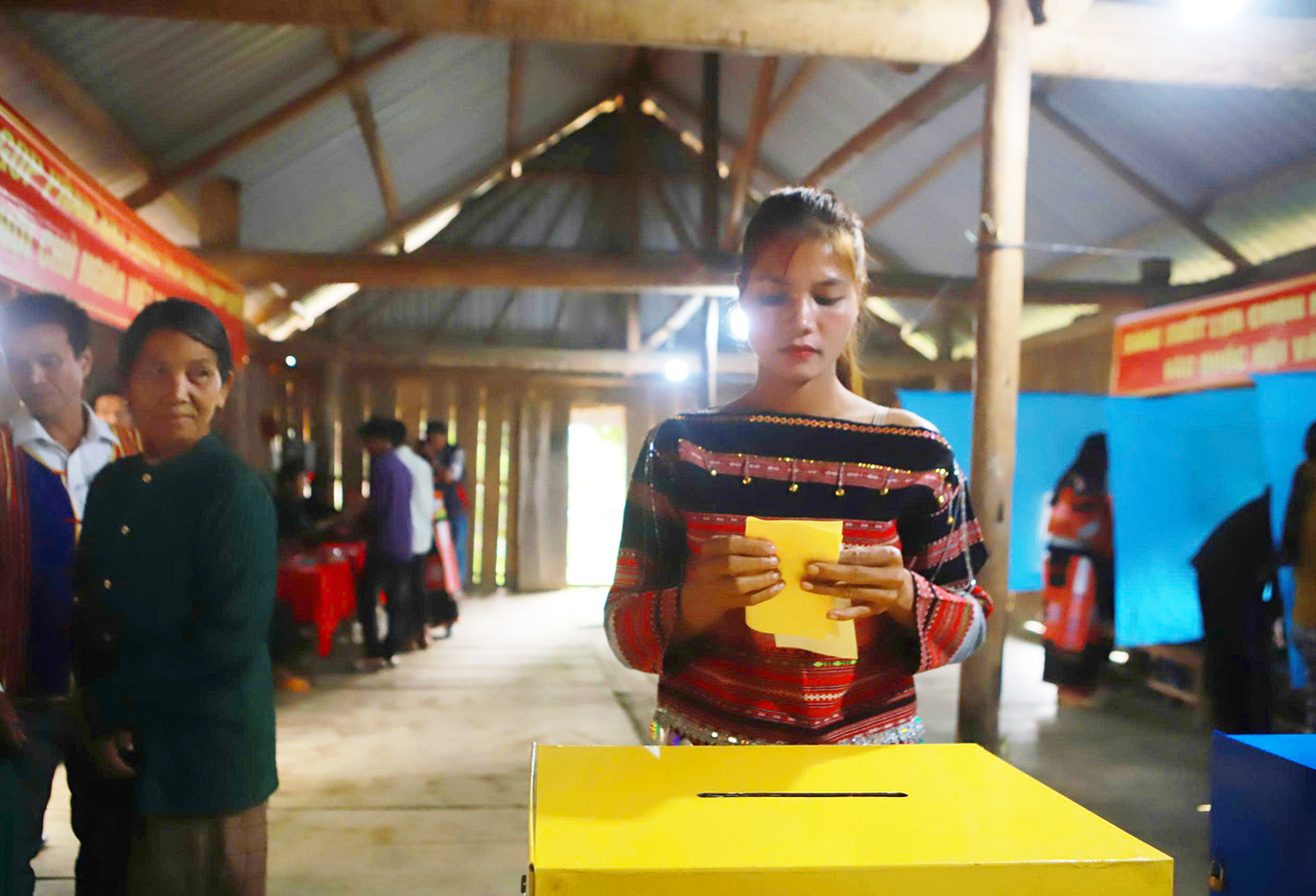 Mặc dù đường sá còn nhiều cách trở, nhưng các cử tri đồng bào Ba Na trong trang phục truyền thống đã nô nức đến điểm bỏ phiếu từ rất sớm, cầm những lá phiếu trên tay với bao kỳ vọng lớn lao.