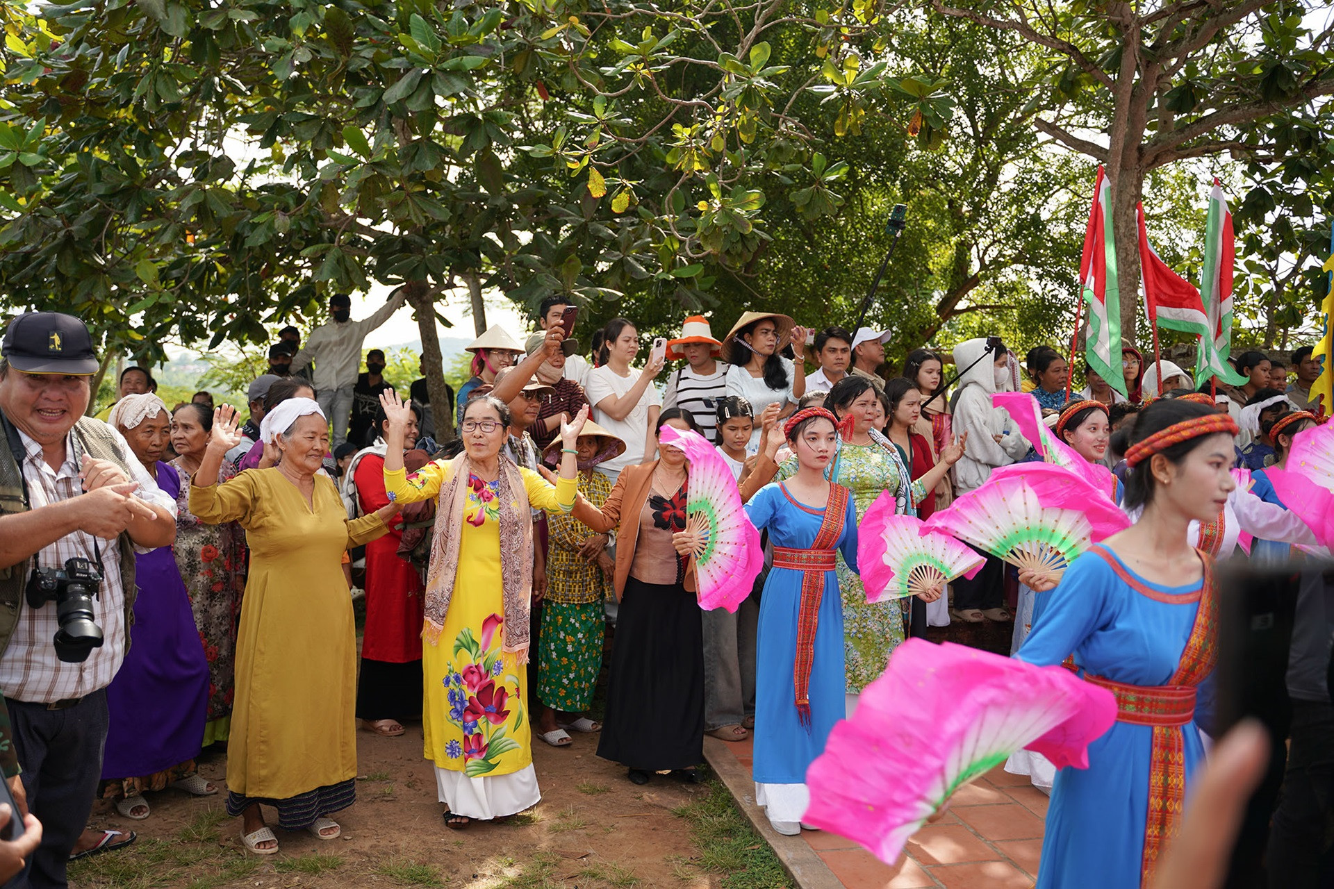 Đồng bào người Chăm cùng người dân, du khách múa hát chào mừng lễ hội. Ảnh: Hữu Tri