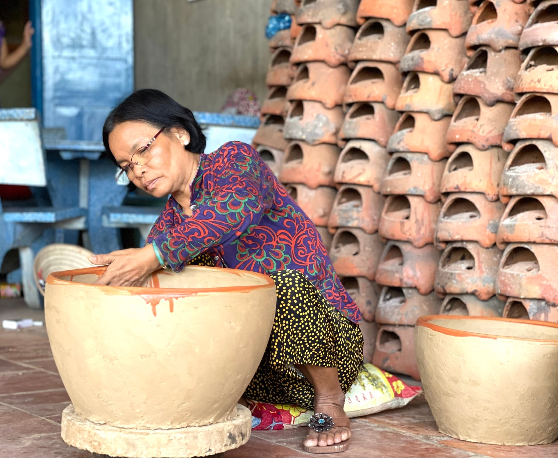 Bà Nguyễn Thị Minh (xã Bắc Bình) đang hoàn thiện các công đoạn làm ra thành phẩm gốm Chăm