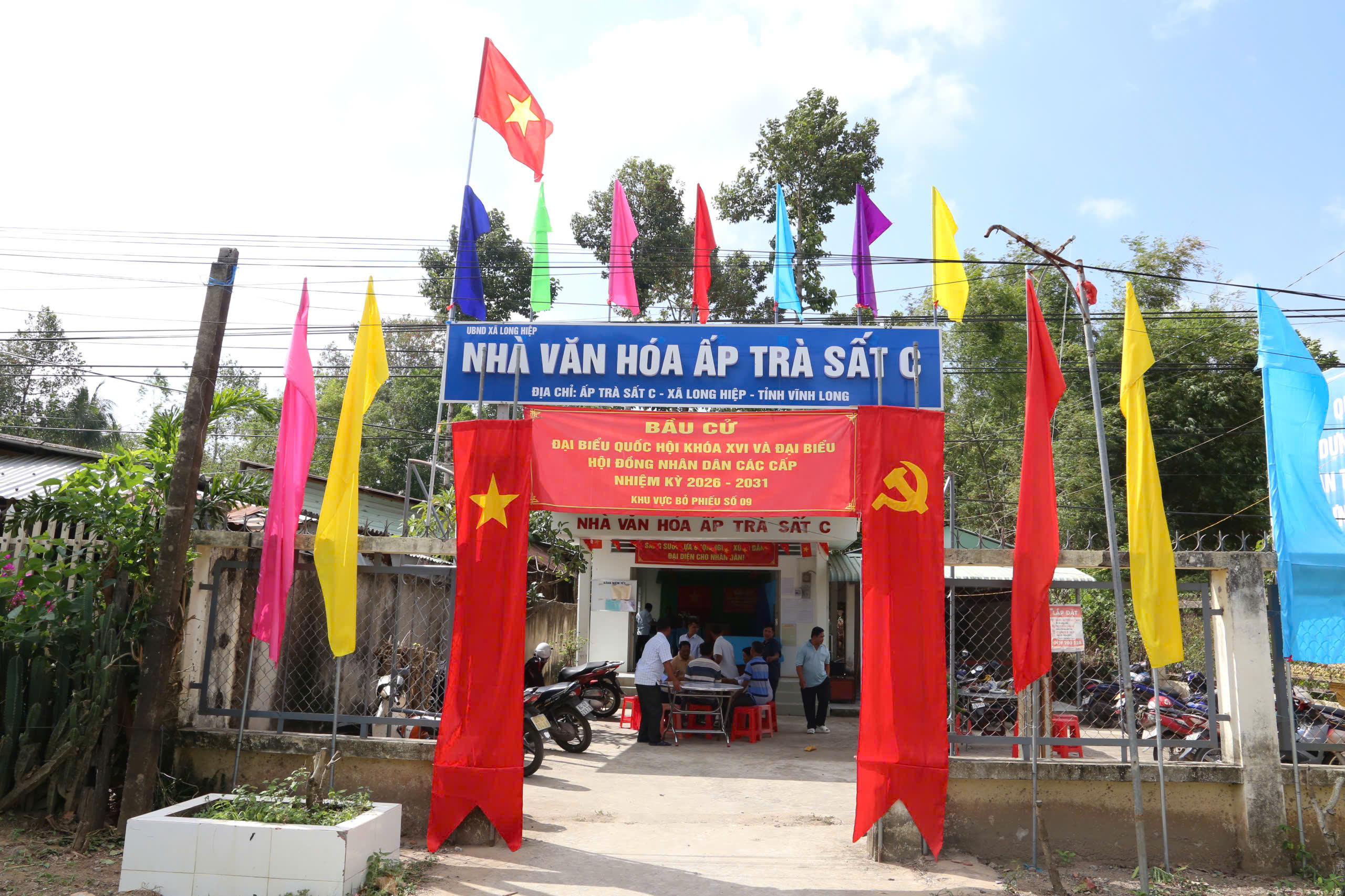 Khu vực bỏ phiếu tại xã Long Hiệp, tỉnh Vĩnh Long rực rỡ cờ hoa