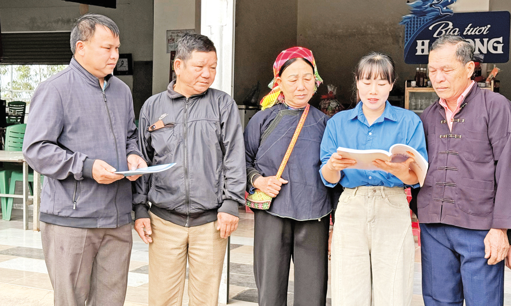 Cán bộ, đoàn viên thôn Tam Chẽ, xã Sơn Hải trực tiếp tuyên truyền về ngày bầu cử đến người dân.