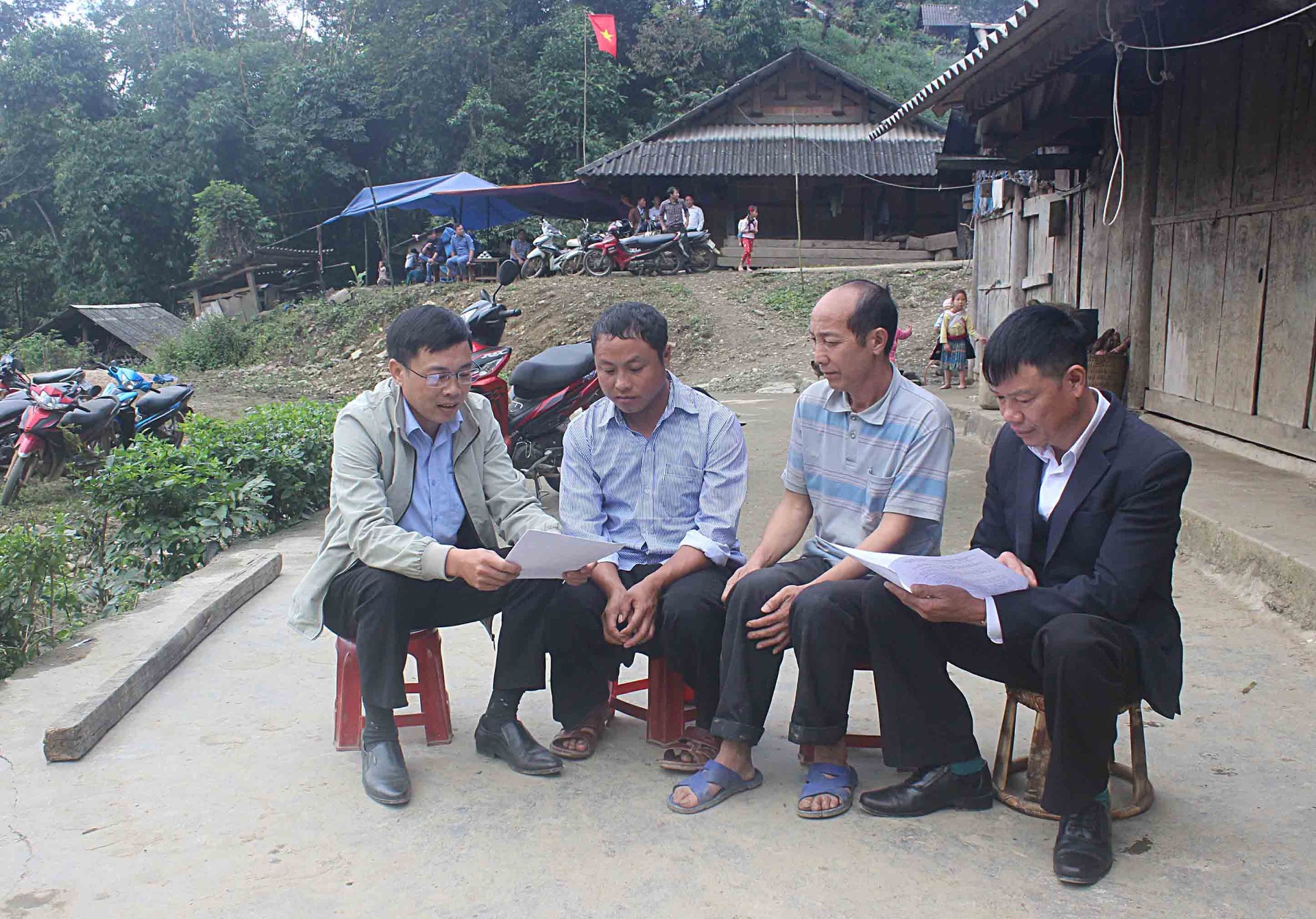 Cán bộ và người dân ở bản Pan Khèo (xã Sin Suối Hồ) thống nhất việc hiến đất làm đường giao thông nông thôn.
