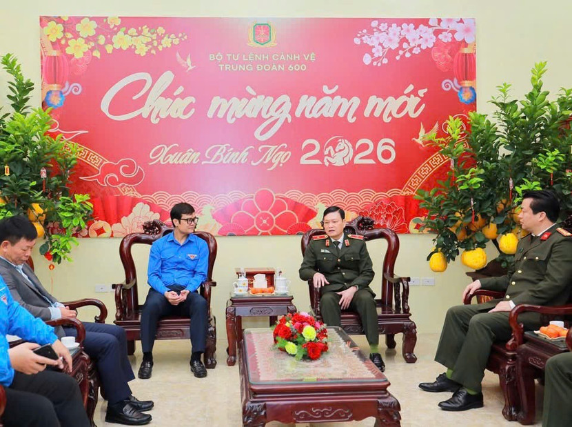 Phát biểu tại buổi gặp, đồng chí Bùi Quang Huy - Ủy viên TW Đảng, Bí thư thứ nhất TW Đoàn chúc mừng Bộ Tư lệnh Cảnh vệ và Trung đoàn 600 nhân dịp kỷ niệm 73 năm Ngày thành lập lực lượng Cảnh vệ (16-2-1953/16-2-2026); lời chúc mừng năm mới sức khỏe, an khang, hoàn thành xuất sắc nhiệm vụ tới toàn thể CBCS, đoàn viên thanh niên Trung đoàn 600 - những người đang ngày đêm bám đơn vị, trực sẵn sàng chiến đấu, bảo đảm tuyệt đối an ninh, an toàn cho các mục tiêu, sự kiện chính trị đặc biệt quan trọng của Đảng, Nhà nước, nhất là trong những ngày Tết cổ truyền của dân tộc.