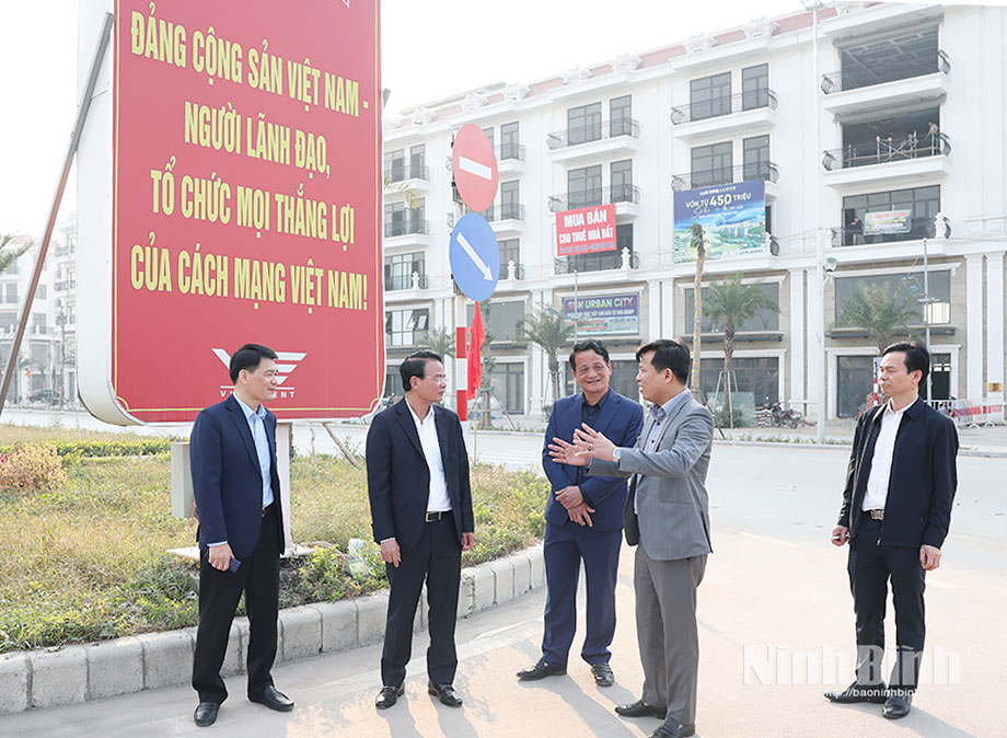 Đồng chí Đặng Xuân Phong, Ủy viên Trung ương Đảng, Bí thư Tỉnh ủy, Trưởng Đoàn đại biểu Quốc hội tỉnh kiểm tra công tác tuyên truyền trực quan tại phường Phủ Lý.
