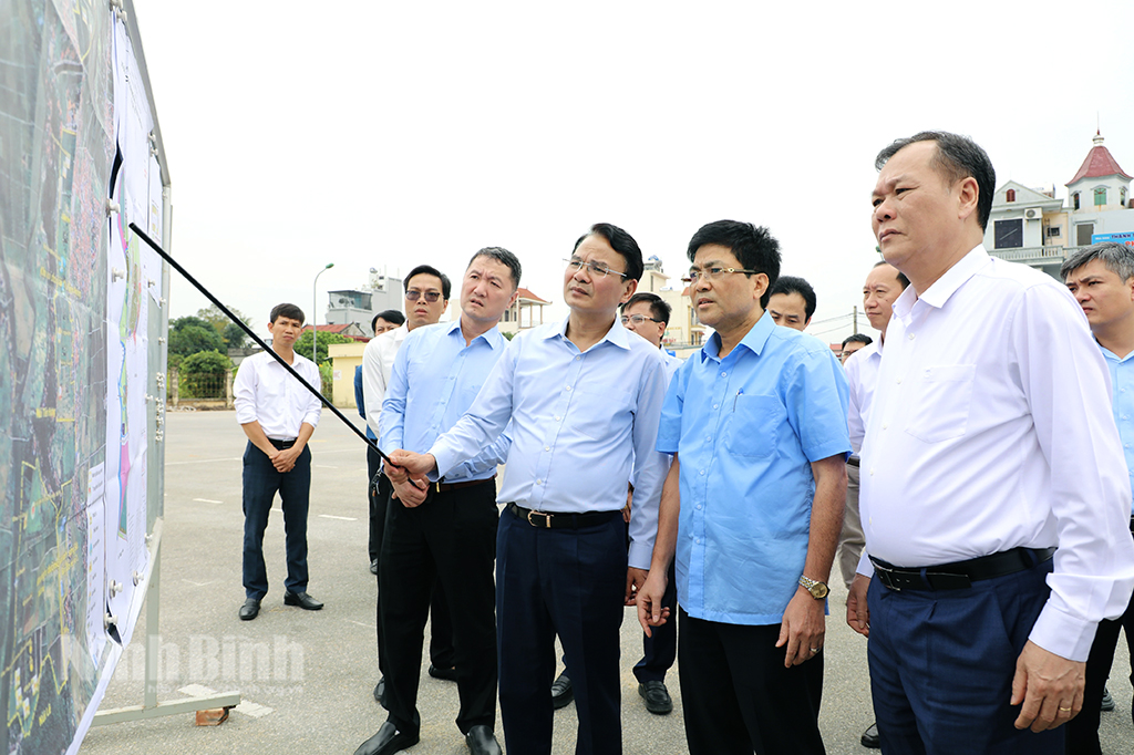 Đồng chí Bí thư Tỉnh ủy Đặng Xuân Phong và các đồng chí lãnh đạo tỉnh thị sát tại Cụm Công nghiệp Kim Thái (thuộc địa phận các xã Vụ Bản và Liên Minh).