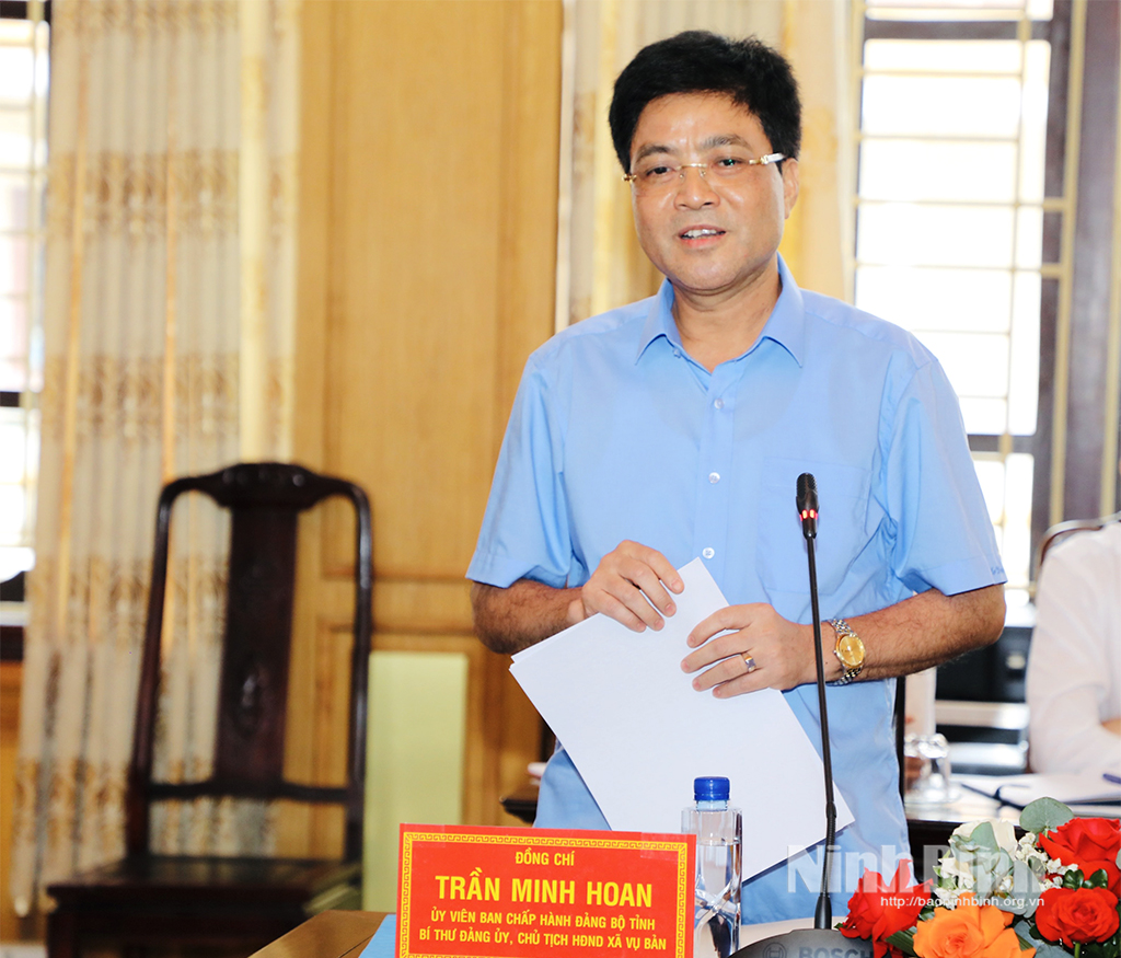 Đồng chí Trần Minh Hoan, Tỉnh ủy viên, Bí thư Đảng ủy, Chủ tịch HĐND xã Vụ Bản phát biểu tại buổi làm việc.