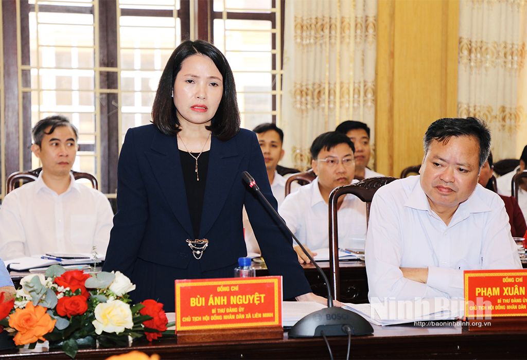 Đồng chí Bùi Ánh Nguyệt, Bí thư Đảng ủy, Chủ tịch HĐND xã Liên Minh phát biểu tại buổi làm việc.