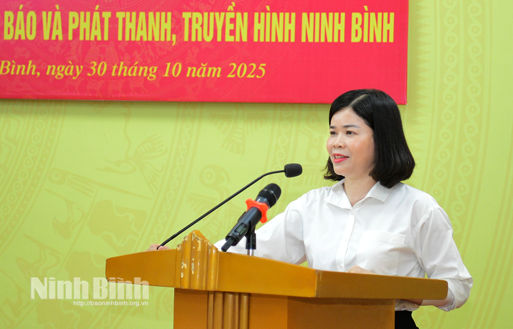 Đồng chí Phạm Thị Thu Hằng, Ủy viên Ban Thường vụ Tỉnh ủy, Tổng Biên tập Báo và phát thanh, truyền hình Ninh Bình báo cáo tình hình hoạt động từ khi hợp nhất đến nay.