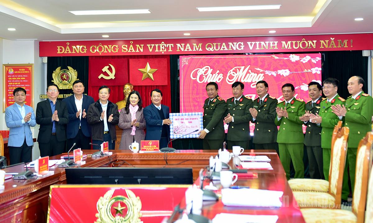 Đồng chí Bí thư Tỉnh ủy Hầu A Lềnh và các đồng chí lãnh đạo tỉnh trao tặng quà Tết cho Công an tỉnh.
