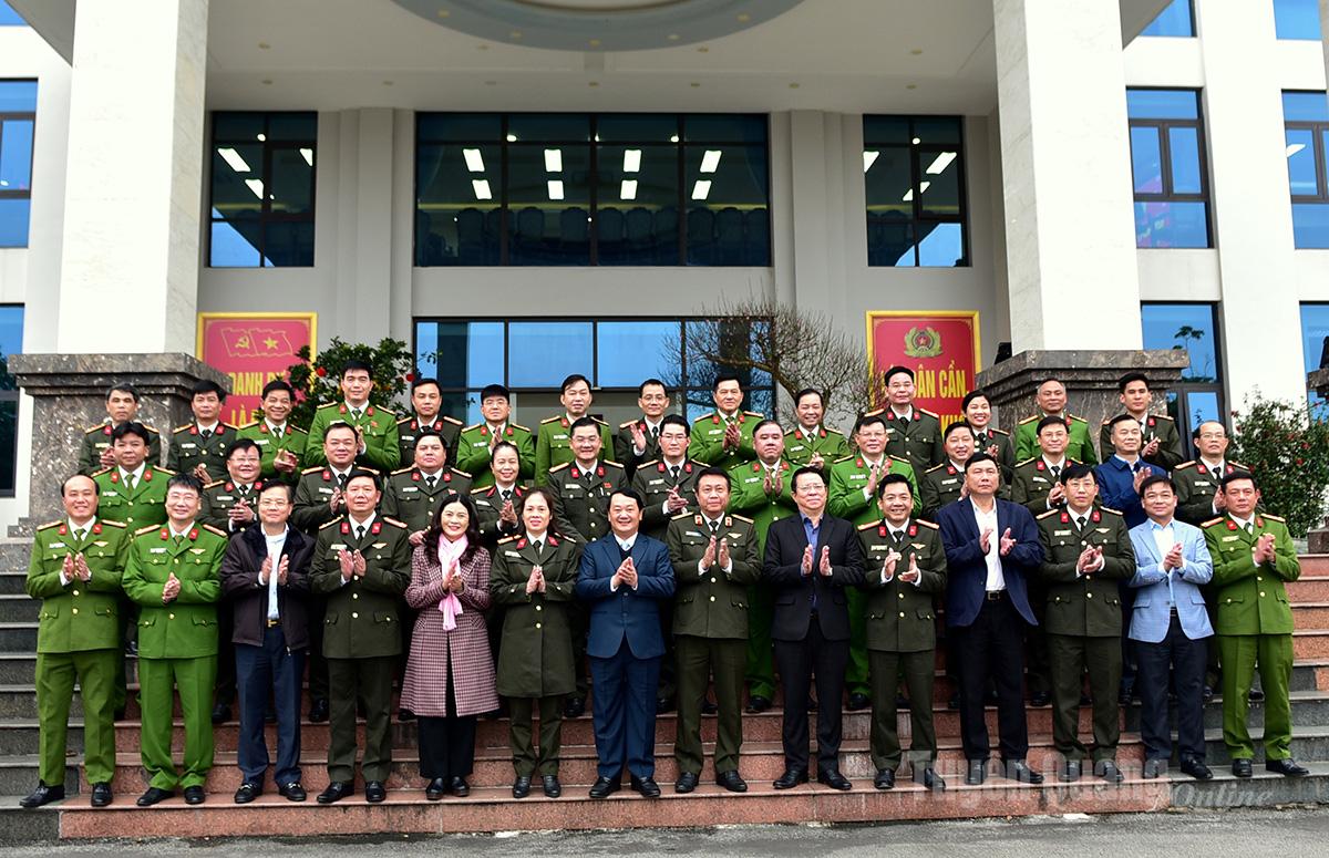 Đồng chí Bí thư Tỉnh ủy Hầu A Lềnh và đại biểu chụp ảnh lưu niệm cùng lãnh đạo Công an tỉnh và chỉ huy các đơn vị cấp phòng thuộc Công an tỉnh.