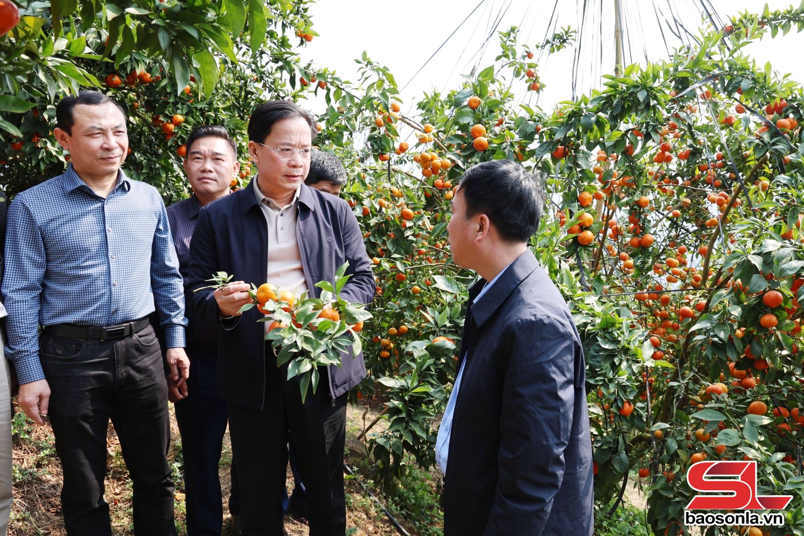 Đồng chí Bí thư Tỉnh ủy thăm mô hình cam đường canh tại bản Hưng Hà, xã Chiềng Khương.